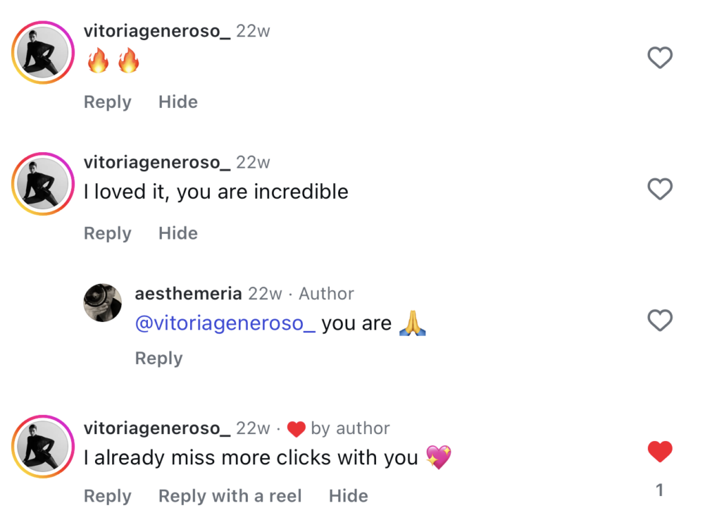 The artistic core of Aesthemeria comprises long-form, legacy works, including invitation-only sessions that explore themes of identity, embodiment, and emotional intimacy through nude, semi-nude, and implied nude artistic portraiture. The resulting work is intended for gallery presentation, limited-edition fine art publications, and selective collaborations with brands (without compromising artistic integrity).